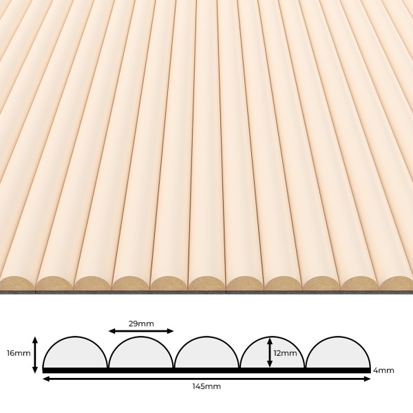Il pannello è composto da cinque lamelle in MDF laminato, fissate su una base in feltro nero da 0,4 cm. Lo strato di feltro assorbe le onde sonore e riduce sensibilmente il rumore, creando un’atmosfera più silenziosa e confortevole.